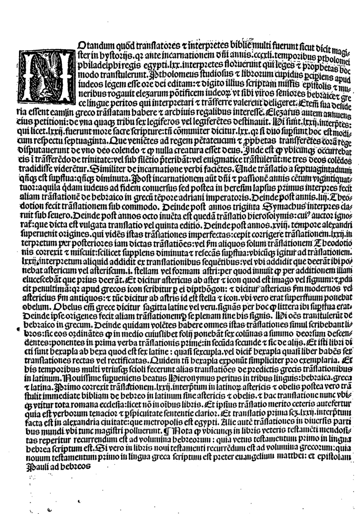 - Novissime superveniens beatus Hieronymus, peritus in tribus linguis: Hebraica, Graeca, et Latina. Primo correxit translationem LXXII interpretum in Latinum, astericis et obelis. Postea vero transtulit immediate bibliam de Hebraico in Latinum sine astericis et obelis. Et hac translatione nunc ubique utitur tota Romana Ecclesia, licet non in omnibus libris.