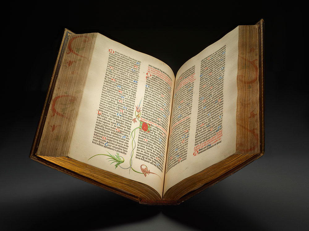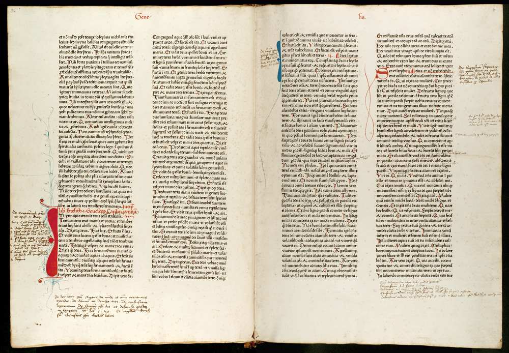The Gutenberg Bible, or the B42 as it is often known (referring to its 42-line columns of text), comprises the full Latin Vulgate text, laid out in a format designed to echo the grandest manuscript bibles of a much earlier time. Though its text was derived from the small and portable thirteenth-century Paris Bible tradition, the Gutenberg Bible was meant to hearken back to the large and imposing lectern bibles of the tenth and eleventh centuries. In this way, though revolutionary from a technological standpoint, the Gutenberg Bible would probably have struck the eye of a fifteenth century reader as rather an old-fashioned book in its material form. At the same time, Gutenberg’s distinctive typeface was modelled closely on the textura script beloved of high medieval scribes writing in the thirteenth century and later. Gutenberg also deliberately left blank spaces to allow for hand-illuminated initials, marginalia, and rubrication. The result was that each copy could still be made unique, allowing patrons to retain the sense of the idiosyncrasies of the manuscripts with which they were so familiar.